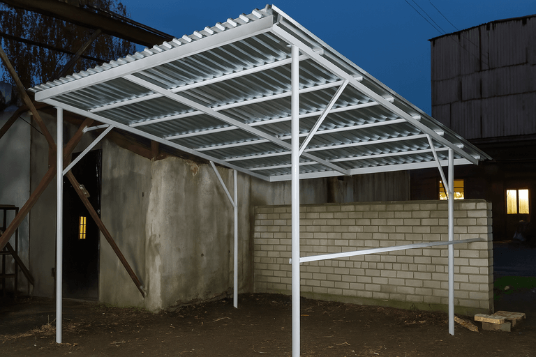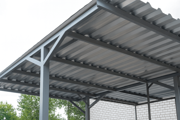 Изготовить навес из профильной трубы можно в короткие сроки — технология позволяет точно рассчитать нагрузки и обеспечить надежность конструкции. Такие навесы подходят для небольших участков и просторных парковочных зон.