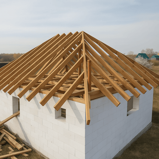 Устанавливаются диагональные, центральные и промежуточные стропила. От точности этого этапа зависит прочность всей конструкции. Мы используем качественный пиломатериал, а все соединения усиливаются металлическими элементами. -